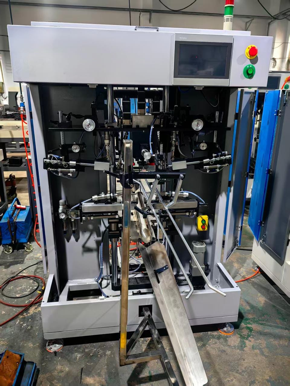 3. Three servo motors drive the wheel rim and calibration wrench. A microcomputer intelligently controls the operating procedures. Photoelectric switches and induction switches detect vibration and control material feeding and discharging, respectively.